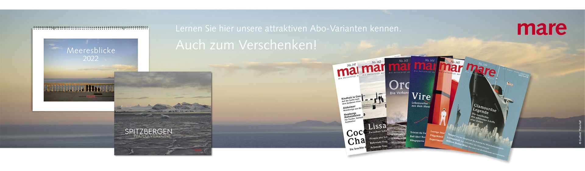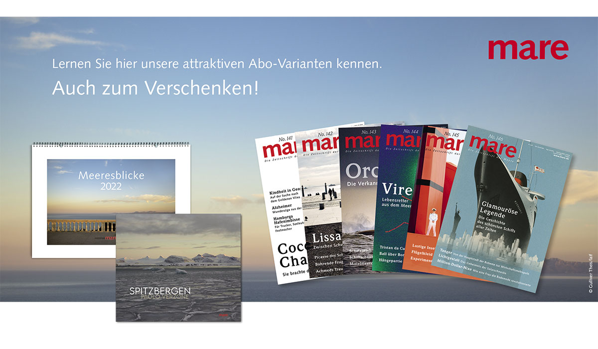 Sie lesen gerne, und Ihnen gefällt mare? mare erscheint 6x im Jahr. Ein Abonnement ist günstiger als Einzelhefte und bietet zusätzliche Vorteile. Lernen Sie unsere attraktiven Abo-Varianten kenn. Auch zum Verschenken.