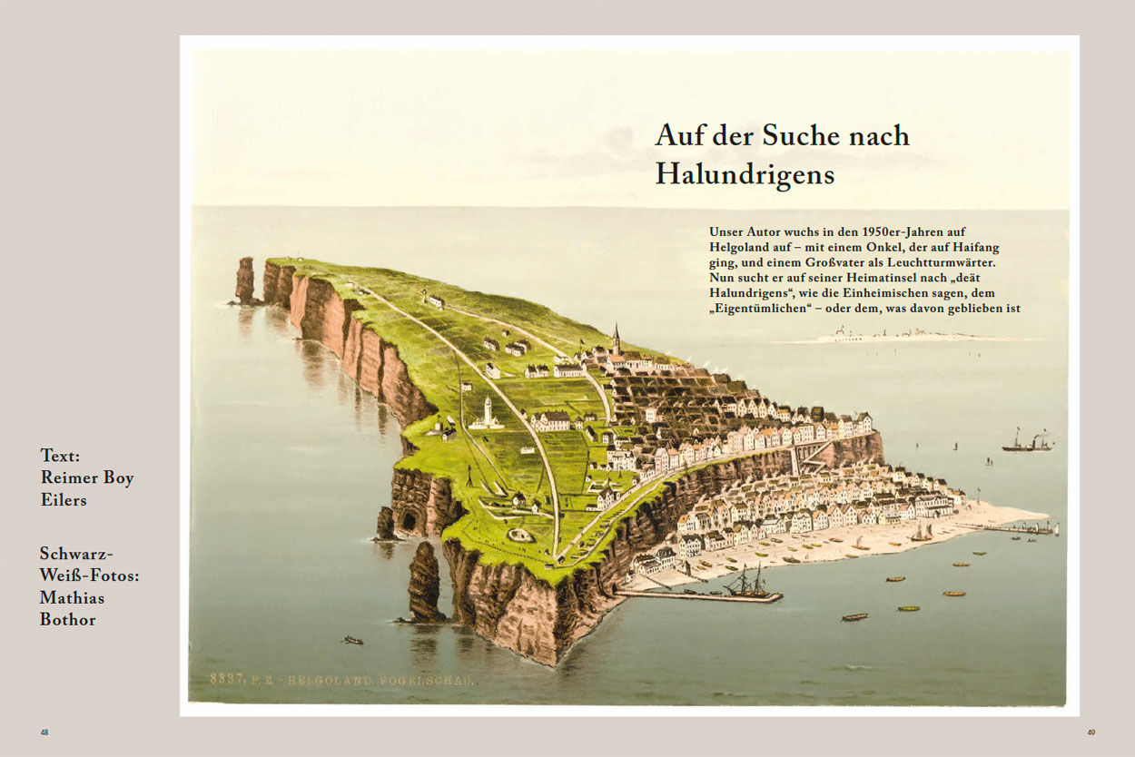 | Vita | Reimer Eilers, Jahrgang 1948, lebt als freier Autor und Schriftsteller in Hamburg. Zur Leipziger Buchmesse 2026 erscheint sein vollständiger Romanzyklus über Ferdinand Magellan und die erste Weltumsegelung. In der Hauptrolle: ein Helgoländer Fischer. Mathias Bothor, 1962, machte sich 1992 als freier Fotograf selbstständig. Heute ist er einer der gefragtesten Porträtfotografen. Geboren auf der damaligen Insel West-Berlin, lebt er jetzt ebenfalls auf einer Insel in Berlin. Helgoland besuchte er für mare das erste Mal vor 20 Jahren für das Porträt eines Ornithologen (mare No. 53). |