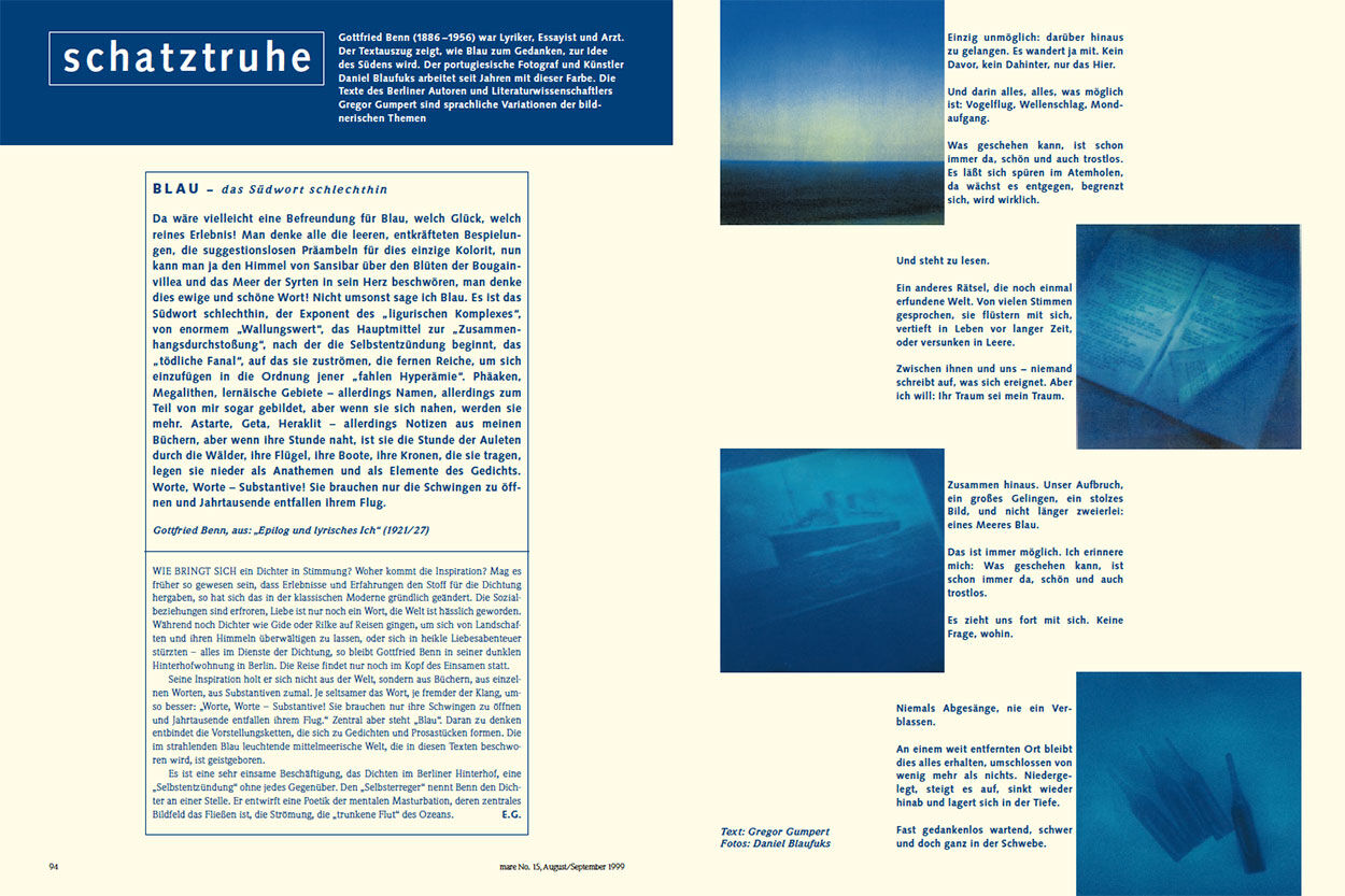 Gottfried Benn (1886 –1956) war Lyriker, Essayist und Arzt. Der Textauszug zeigt, wie Blau zum Gedanken, zur Idee des Südens wird. Der portugiesische Fotograf und Künstler Daniel Blaufuks arbeitet seit Jahren mit dieser Farbe. Die Texte des Berliner Autoren und Literaturwissenschaftlers Gregor Gumpert sind sprachliche Variationen der bildnerischen Themen