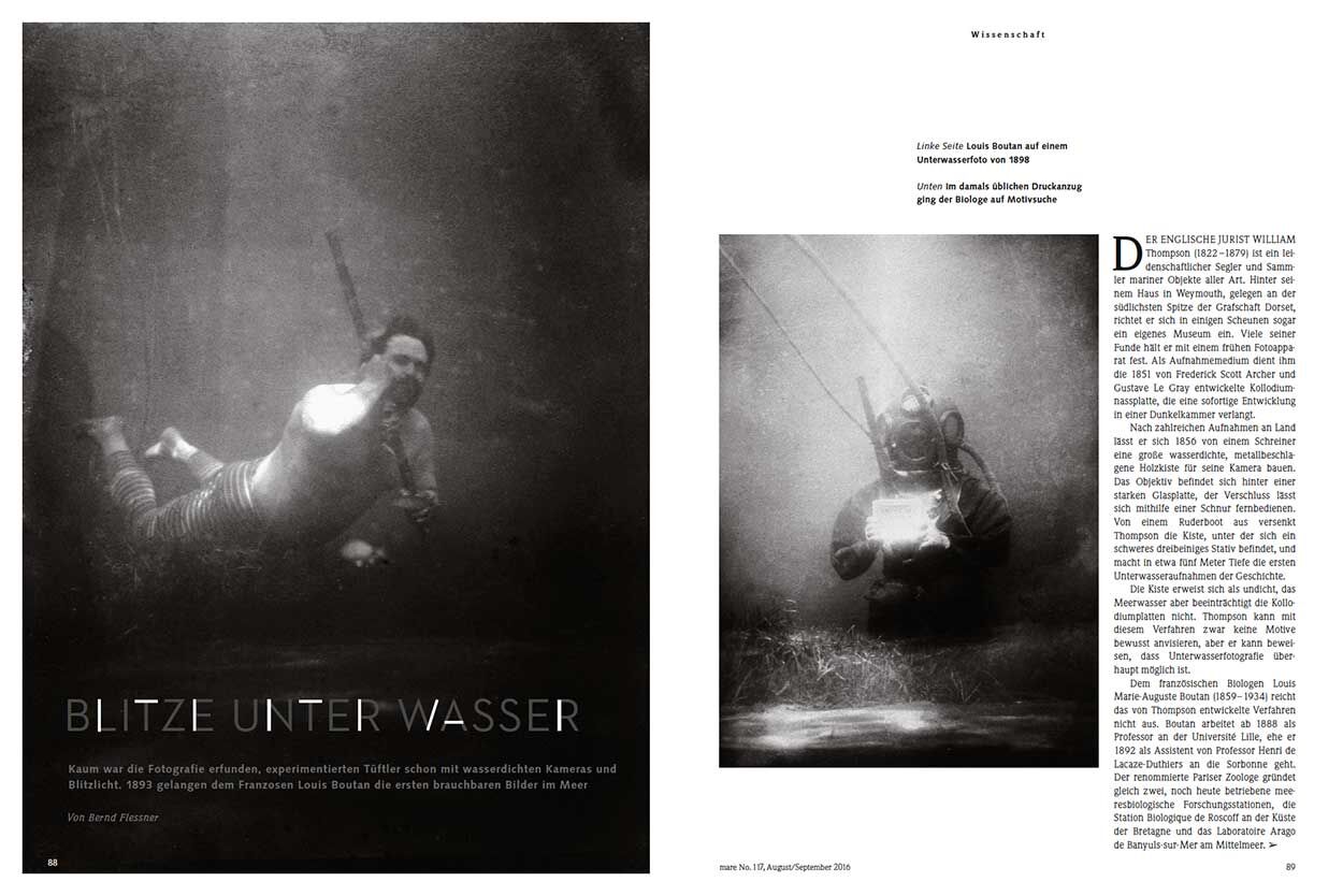 Kaum war die Fotografie erfunden, experimentierten Tüftler schon mit wasserdichten Kameras und Blitzlicht. 1893 gelangen dem Franzosen Louis Boutan die ersten brauchbaren Bilder im Meer.