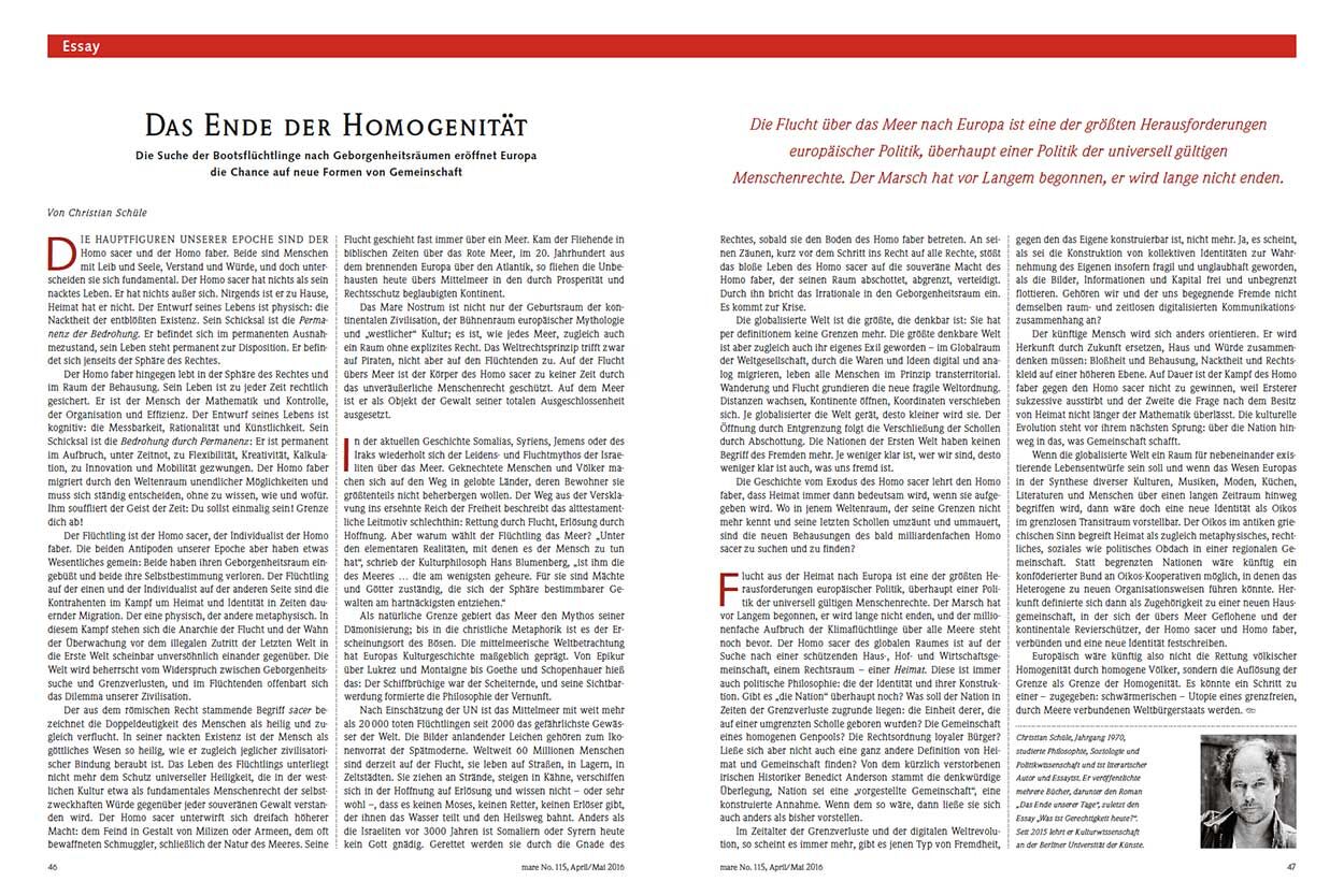 Der Flüchtling ist der Homo sacer, der Individualist der Homo faber. Die beiden Antipoden unserer Epoche aber haben etwas Wesentliches gemein: Beide haben ihren Geborgenheitsraum eingebüßt und beide ihre Selbstbestimmung verloren. Der Flüchtling auf der einen und der Individualist auf der anderen Seite sind die Kontrahenten im Kampf um Heimat und Identität in Zeiten dauernder Migration. Der eine physisch, der andere metaphysisch. In diesem Kampf stehen sich die Anarchie der Flucht und der Wahn der Überwachung vor dem illegalen Zutritt der Letzten Welt in die Erste Welt scheinbar unversöhnlich einander gegenüber. Die Welt wird beherrscht vom Widerspruch zwischen Geborgenheitssuche und Grenzverlusten, und im Flüchtenden offenbart sich das Dilemma unserer Zivilisation.