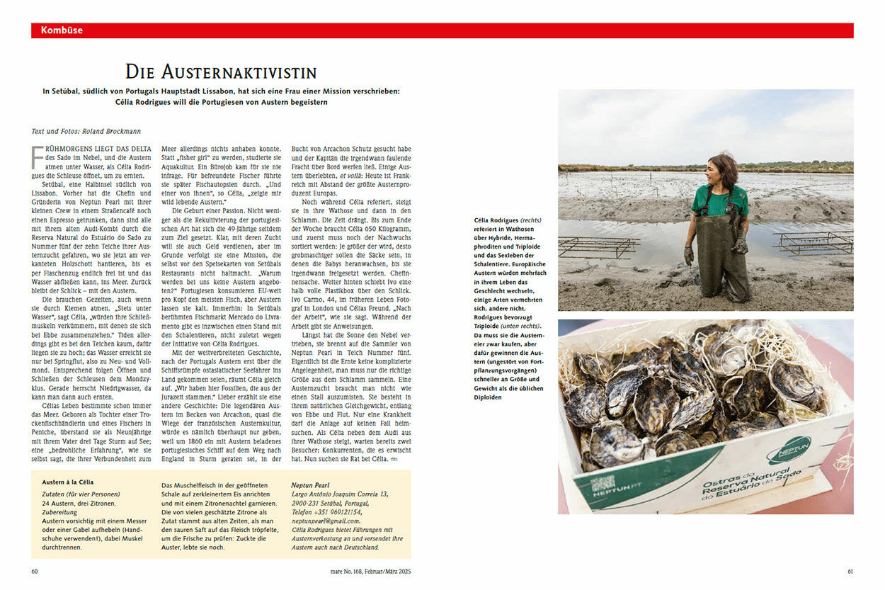 Célias Leben bestimmte schon immer das Meer. Geboren als Tochter einer Trockenfischhändlerin und eines Fischers in Peniche, überstand sie als Neunjährige mit ihrem Vater drei Tage Sturm auf See; eine „bedrohliche Erfahrung“, wie sie selbst sagt, die ihrer Verbundenheit zum Meer allerdings nichts anhaben konnte. Statt „fisher girl“ zu werden, studierte sie Aquakultur. Ein Bürojob kam für sie nie infrage. Für befreundete Fischer führte sie später Fischautopsien durch. „Und einer von ihnen“, so Célia, „zeigte mir wild lebende Austern.“