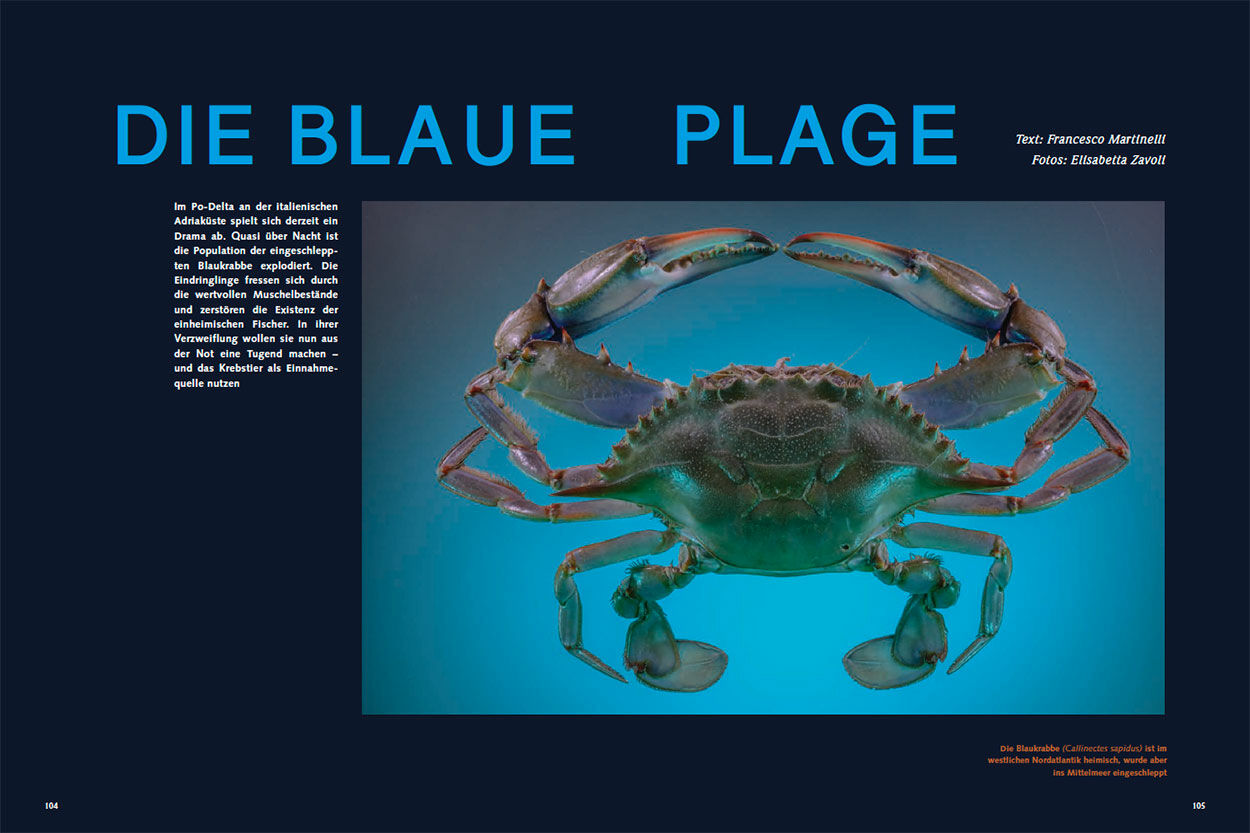 | Vita | Als Francesco Martinelli, Jahrgang 1987, Wissenschaftsautor in Bologna in Mittelitalien, im Februar 2022 begann, sich mit der Blaukrabbe zu beschäftigen, ahnte noch niemand etwas von der Gefahr durch die Invasoren. Die italienische Fotografin Elisabetta Zavoli, Jahrgang 1976, ist nicht weit von Goro entfernt aufgewachsen. Umso mehr bewegt sie dieses Thema. |
