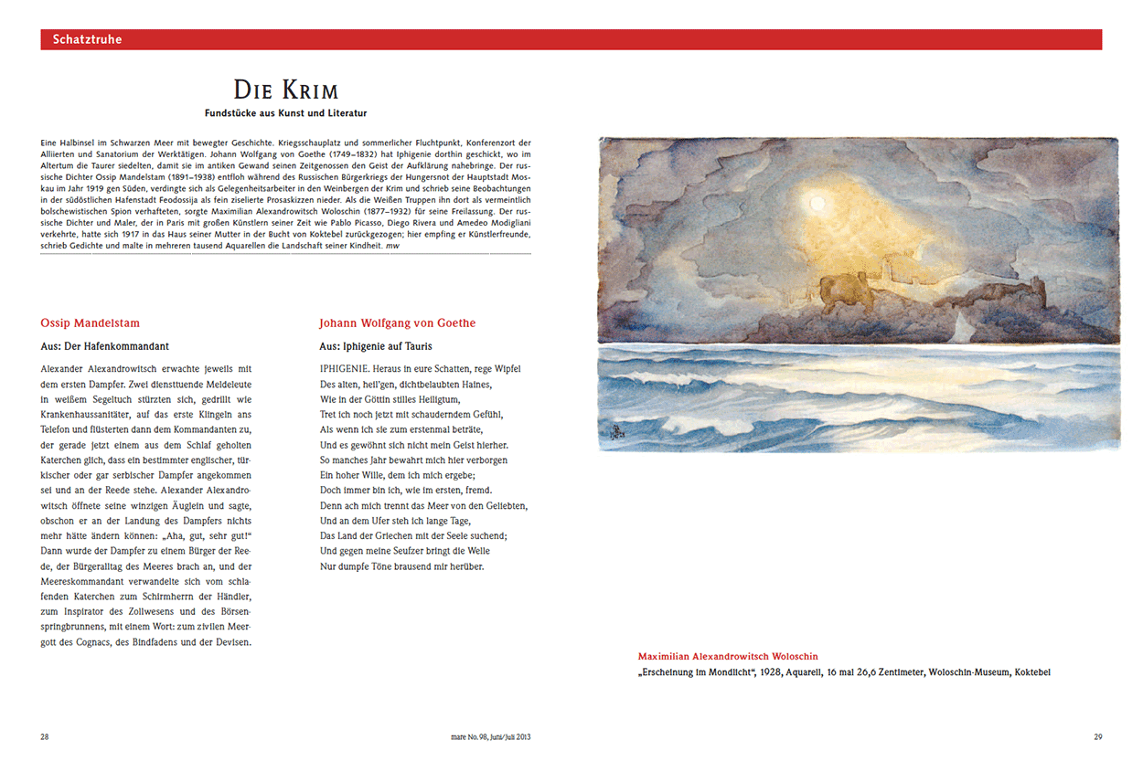 Eine Halbinsel im Schwarzen Meer mit bewegter Geschichte. Kriegsschauplatz und sommerlicher Fluchtpunkt, Konferenzort der Alliierten und Sanatorium der Werktätigen. Johann Wolfgang von Goethe (1749–1832) hat Iphigenie dorthin geschickt, wo im Altertum die Taurer siedelten, damit sie im antiken Gewand seinen Zeitgenossen den Geist der Aufklärung nahebringe. Der russische Dichter Ossip Mandelstam (1891–1938) entfloh während des Russischen Bürgerkriegs der Hungersnot der Hauptstadt Moskau im Jahr 1919 gen Süden, verdingte sich als Gelegenheitsarbeiter in den Weinbergen der Krim und schrieb seine Beobachtungen in der südöstlichen Hafenstadt Feodossija als fein ziselierte Prosaskizzen nieder. Als die Weißen Truppen ihn dort als vermeintlich bolschewistischen Spion verhafteten, sorgte Maximilian Alexandrowitsch Woloschin (1877–1932) für seine Freilassung. Der russische Dichter und Maler, der in Paris mit großen Künstlern seiner Zeit wie Pablo Picasso, Diego Rivera und Amedeo Modigliani verkehrte, hatte sich 1917 in das Haus seiner Mutter in der Bucht von Koktebel zurückgezogen; hier empfing er Künstlerfreunde, schrieb Gedichte und malte in mehreren tausend Aquarellen die Landschaft seiner Kindheit. mw
