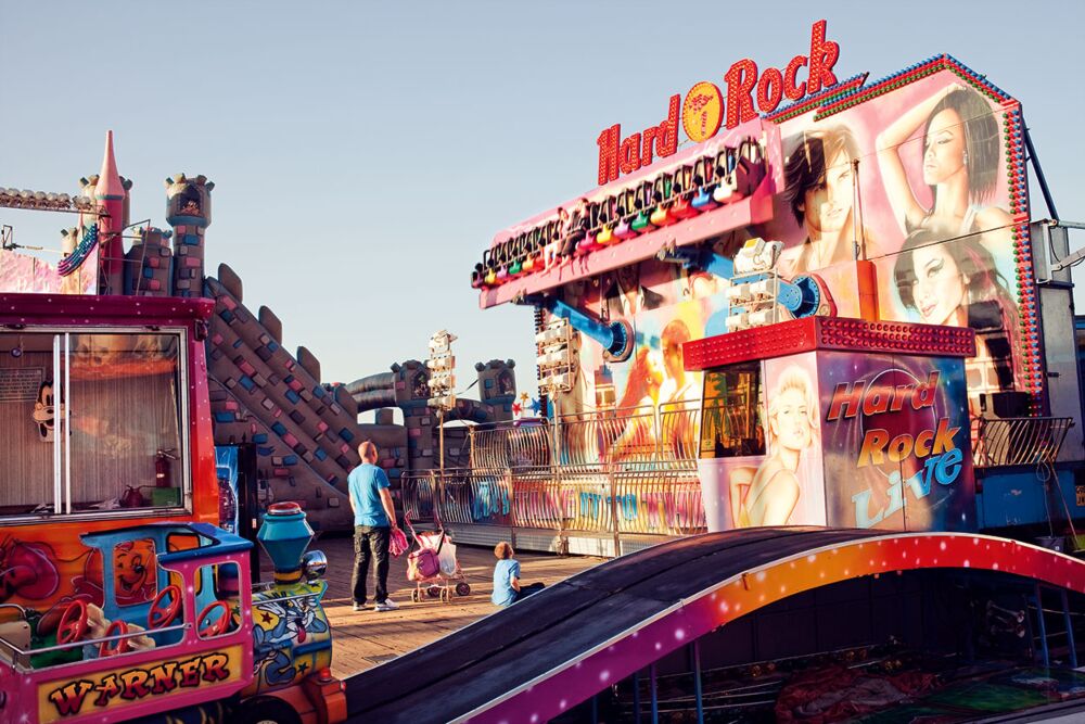 Draußen fährt gerade die lichterkettenumgürtete Tram vom Nord- zum Zentral- und weiter zum Südpier. Seit 126 Jahren rumpeln die überlackten, teils doppelstöckigen Holzwagen an der Promenade die „Goldene Meile“ auf und ab, 18 Kilometer von Cleveleys und Fleetwood die Küste südwärts zum so schäbig-alten wie neuerdings chic gestylten Vergnügungspark „Pleasure Beach“, parallel zum ewig langen Spazier- und Fahrradweg; und seit mindestens 126 Jahren fressen unter den Holzplankenstegen der Piers die Gezeiten an den Streben und Pfeilern aus Stahl, und während sich oben, in den Kabaretts, Bars und Showrooms, die Ausgelassenheit in die jeweils neue Runde katapultiert, halten unten die Arbeiter den Verfall auf. Sie schweißen Zukunft an Vergangenheit und setzen neue Streben ins Gewerk, bis die nächste Flut kommt und das schwarze Wasser durchs Gerüst schäumt und die Schläge seines Aufpralls grummeln wie Seufzer einer düs-teren Seele.