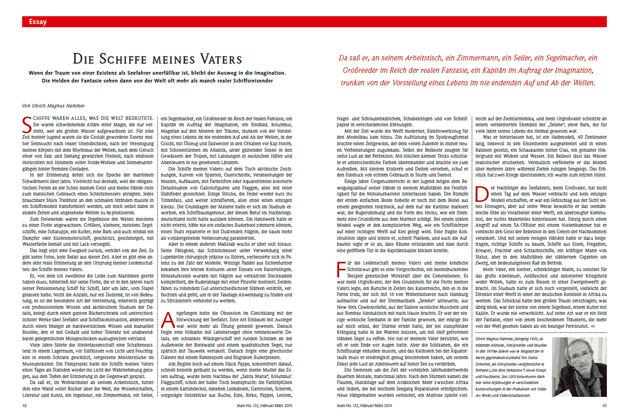 Die Schiffe meines Vaters: auf dem Tisch akribische Zeichnungen, Kurven von Spanten, Querschnitte, Verankerungen der Masten, Aufbauten, mit Farbstiften oder Aquarelltinten kolorierte Detailstudien von Galionsfiguren und Flaggen, alles mit einer Stahlfeder gezeichnet. Einige Striche, die Feder wieder kurz ins Tintenfass, und weiter schraffieren, alles ohne einen einzigen Klecks. Die Grundlagen der Materie hatte er sich im Studium erworben, ein Schiffbauingenieur, der diesen Beruf im Nachkriegsdeutschland nicht hatte ausüben können. Ein Handwerk hatte er nicht erlernt, hätte nie ein einfaches Ruderboot zimmern können, einen Stuhl reparierte er mit Dutzenden Nägeln, die kaum mehr als vorübergehende Verbesserung garantierten.