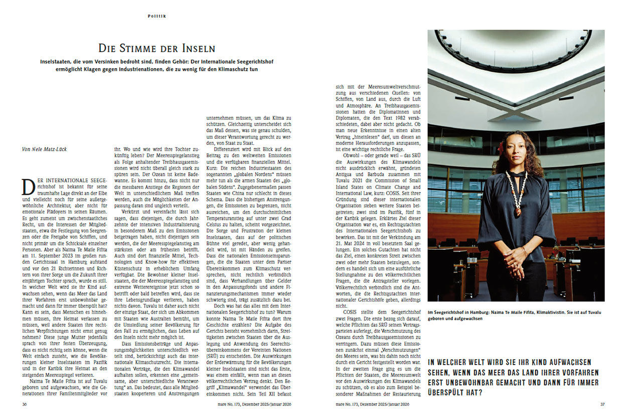 Der Internationale Seegerichtshof ist bekannt für seine traumhafte Lage direkt an der Elbe und vielleicht noch für seine außergewöhnliche Architektur, aber nicht für emotionale Plädoyers in seinen Räumen. Es geht zumeist um zwischenstaatliches Recht, um die Interessen der Mitgliedstaaten, etwa die Festlegung von Seegrenzen oder die Freigabe von Schiffen, und nicht primär um die Schicksale einzelner Personen. Aber als Naima Te Maile Fifita am 11. September 2023 im großen runden Gerichtssaal in Hamburg aufstand und vor den 21 Richterinnen und Richtern von ihrer Sorge um die Zukunft ihrer einjährigen Tochter sprach, wurde es still. In welcher Welt wird sie ihr Kind aufwachsen sehen, wenn das Meer das Land ihrer Vorfahren erst unbewohnbar gemacht und dann für immer überspült hat? Kann es sein, dass Menschen es hinnehmen müssen, ihre Heimat verlassen zu müssen, weil andere Staaten ihre rechtlichen Verpflichtungen nicht ernst genug nehmen? Diese junge Mutter jedenfalls sprach von ihrer festen Überzeugung, dass es nicht richtig sein könne, wenn die Welt einfach zusieht, wie die Bevölkerungen kleiner Inselstaaten im Pazifik und in der Karibik ihre Heimat an den steigenden Meeresspiegel verlieren.