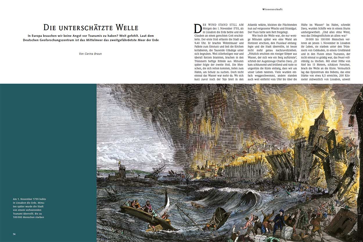 In Europa sind Tsunamis einer breiten Öffentlichkeit erst seit 2004 bekannt, als gigantische Wellen am Indischen Ozean rund 230 000 Einheimische und Touristen in den Tod rissen. Dass der Begriff Tsunami – auf deutsch „Hafenwelle“ – aus dem Japanischen kommt, festigte rasch den Eindruck eines rein asiatischen Phänomens. „Aber auch in Europa sind solche Katastrophen möglich“, sagt Jörn Lauterjung vom Deutschen Geoforschungszentrum (GFZ) in Potsdam. Der Tsunami von Lissabon war nur einer von vielen.