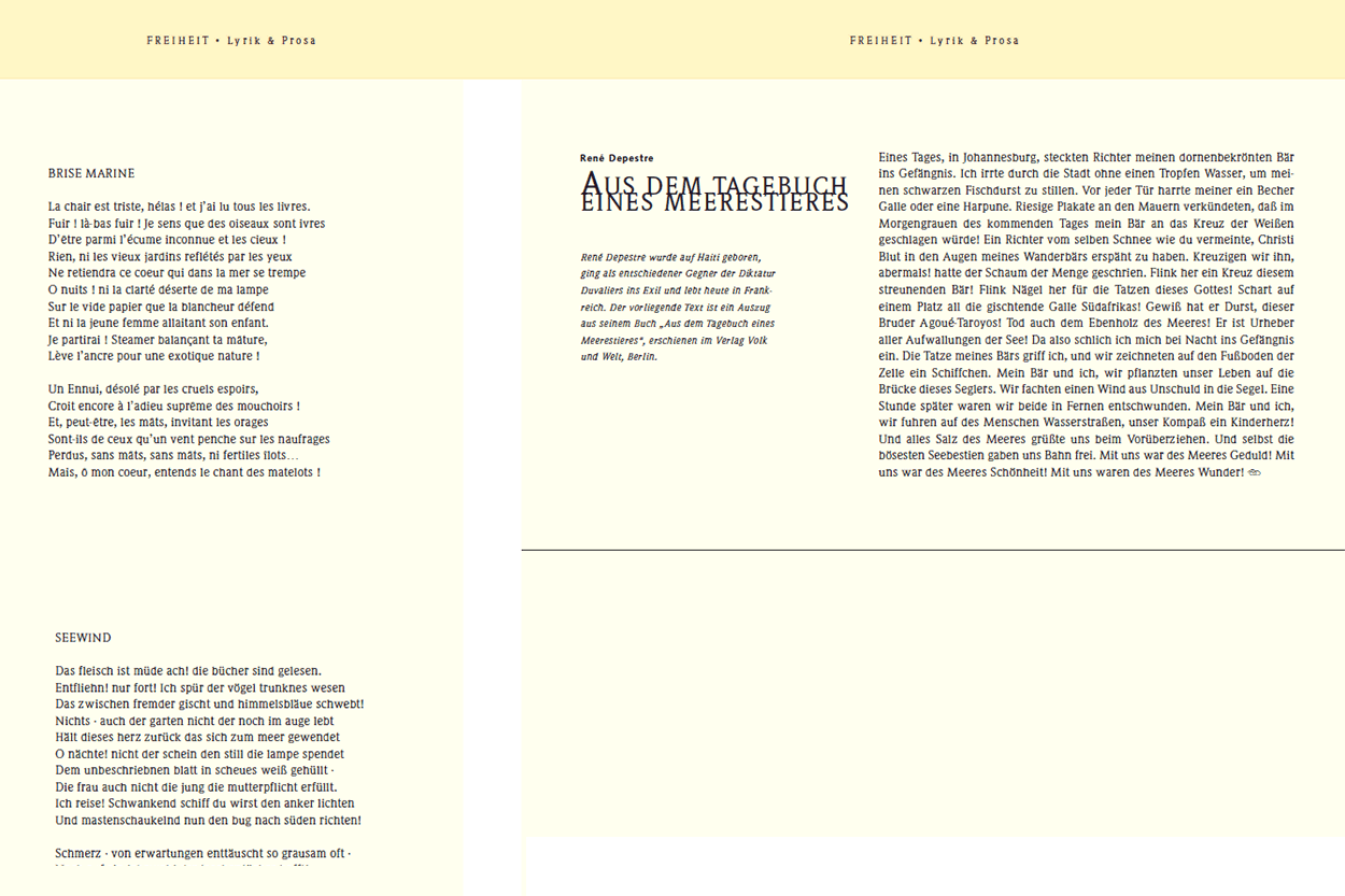 René Depestre wurde auf Haiti geboren, ging als entschiedener Gegner der Diktatur Duvaliers ins Exil und lebt heute in Frankreich. Der vorliegende Text ist ein Auszug aus seinem Buch „Aus dem Tagebuch eines Meerestieres“, erschienen im Verlag Volk und Welt, Berlin.