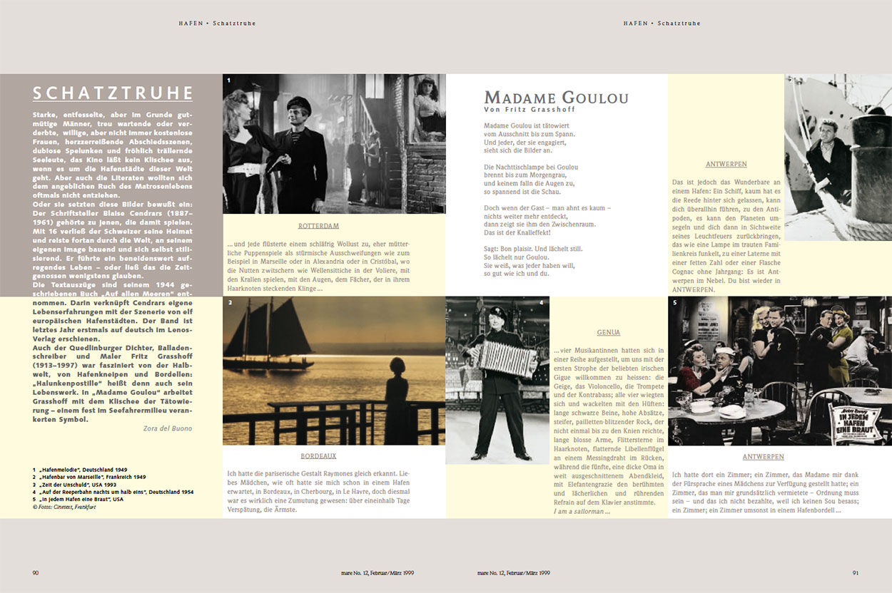 Starke, entfesselte, aber im Grunde gutmütige Männer, treu wartende oder verderbte, willige, aber nicht immer kostenlose Frauen, herzzerreißende Abschiedsszenen, dubiose Spelunken und fröhlich trällernde Seeleute, das Kino läßt kein Klischee aus, wenn es um die Hafenstädte dieser Welt geht. Aber auch die Literaten wollten sich dem angeblichen Ruch des Matrosenlebens oftmals nicht entziehen.