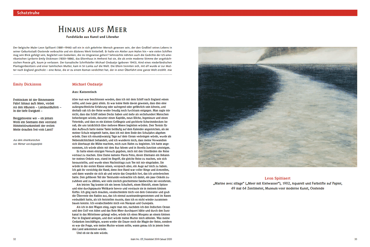 Der belgische Maler Leon Spilliaert (1881–1946) soll ein in sich gekehrter Mensch gewesen sein, der den Großteil seines Lebens in seiner Geburtsstadt Oostende verbrachte und ein düsteres Werk hinterließ. Er hatte ein Atelier zum Hafen hin – wie vielen Schiffen mag sein Blick gefolgt sein, begleitet von Gedanken, die ins Ungewisse gehen? Sehnsüchte nährten auch die Gedichte der US-amerikanischen Lyrikerin Emily Dickinson (1830–1886), das Elternhaus in Amherst hat sie, die als erste moderne Stimme der angelsächsischen Poesie gilt, kaum je verlassen. Der kanadische Schriftsteller Michael Ondaatje (geboren 1943), Kind eines niederländischen Plantagenbesitzers und einer tamilischen Mutter, kam in Sri Lanka auf die Welt. Die Eltern trennten sich, mit elf wurde er zur Mutter nach England geschickt – eine Reise, die er zu einem Roman verdichtet hat, der in einer Überfahrt eine ganze Welt erzählt. mw