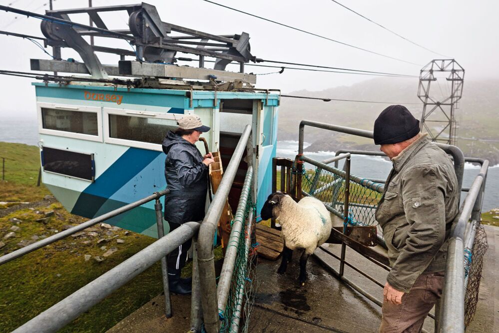 Die Insulaner hätten 1969 auch eine Brücke haben können, aber die wäre erstens teuer und zweitens ein Hindernis für die Fischer gewesen. Man entschied sich, eine Seilbahn zu bauen, die in 30 Meter Höhe über den Sund surrt und so den Kuttern nicht in die Quere kommt. Die Konstruktion ist einfach: Hüben und drüben ein Gittermast, zwei Trossen tragen die Gondel, ein Stahlseil zieht sie von Ost nach West. Die Gondel selbst ist eine simple Stahlbox, gerade so groß, dass auch eine Kuh hineinpasst. Denn darauf kam es an – es sollte ein Vehikel für die Inselbewohner und ihre Tiere sein. Die Tragfähigkeit war mit 550 Kilogramm entsprechend berechnet, Komfort nicht vorgesehen. Solide ist die Kiste, leicht zu säubern. Durch die Ritzen im Boden sieht man das schäumende Wasser im Sund.