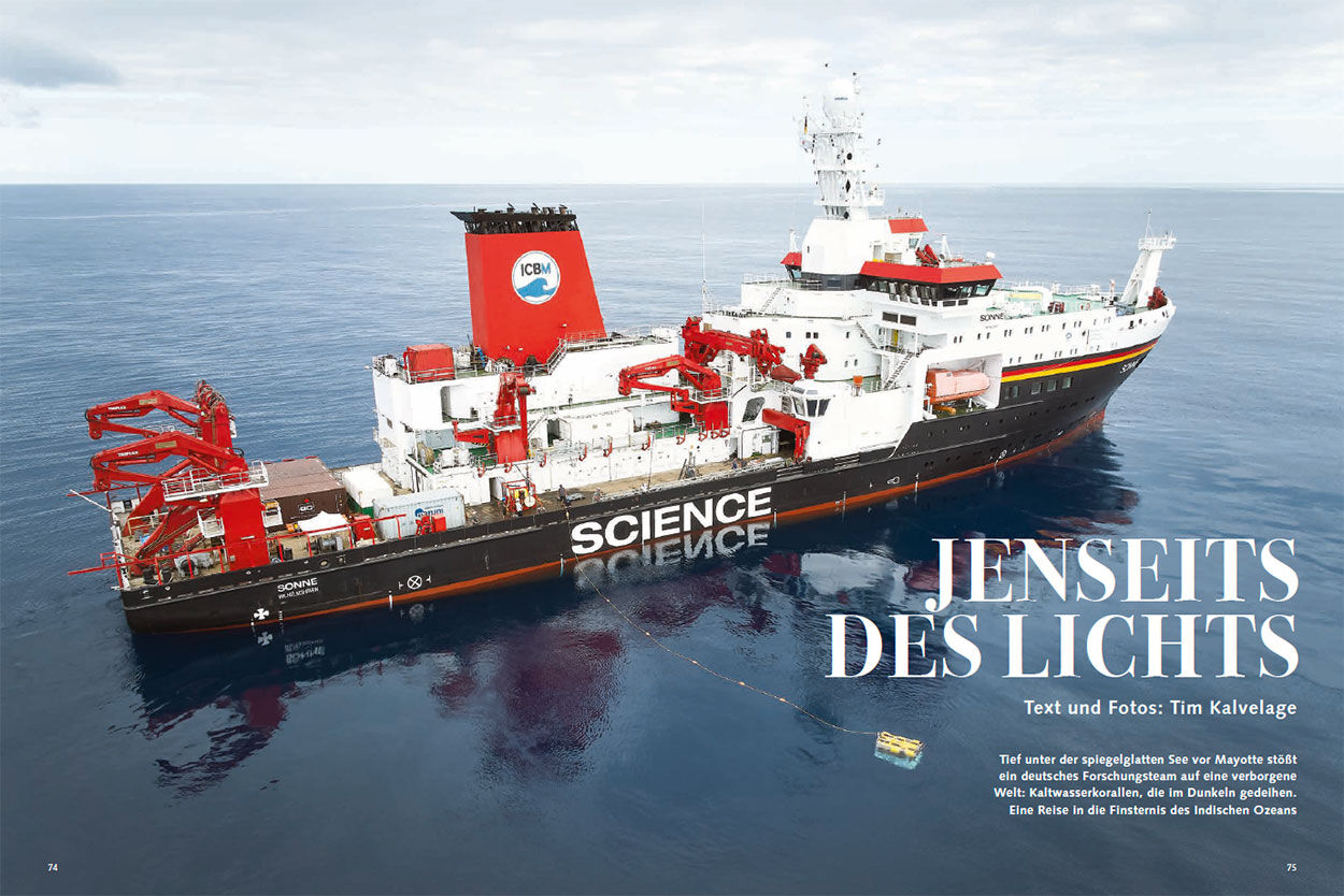 Die See vor der Insel Mayotte, nordwestlich von Madagaskar, ist spiegelglatt. Perfektes Tauchwetter. Am Kran baumelnd, geht das ferngesteuerte Unterwasserfahrzeug (ROV) über Bord und sinkt kurz darauf ins Blau des tropischen Ozeans ab. Von einer Winde an Deck der „Sonne“ werden rund 700 Meter eines dicken Strom- und Datenkabels abgespult. Dann flimmern im Kontrollraum die ersten Bilder vom Meeresboden über die Monitore.