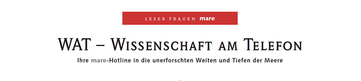 Ihre maritimen Fragen können Sie per Telefon (0800/218 218 2, gebührenfrei) oder E-Mail (wat@mare.de) stellen. Es antworten Ihnen Jana Stone und Ulrike Prange von MARUM – Zentrum für Marine Umweltwissenschaften der Universität Bremen.