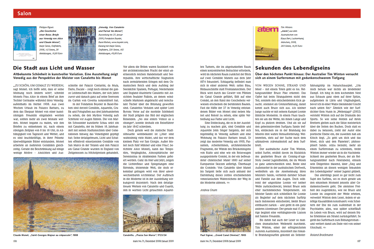 Philippe Piguet: „Die Geschichte einer Reise. Briefe aus Venedig von Alice und Claude Monet“, Hatje Cantz, Ostfildern, 2008, 112 Seiten, 28 Abbildungen, 19,80 Euro