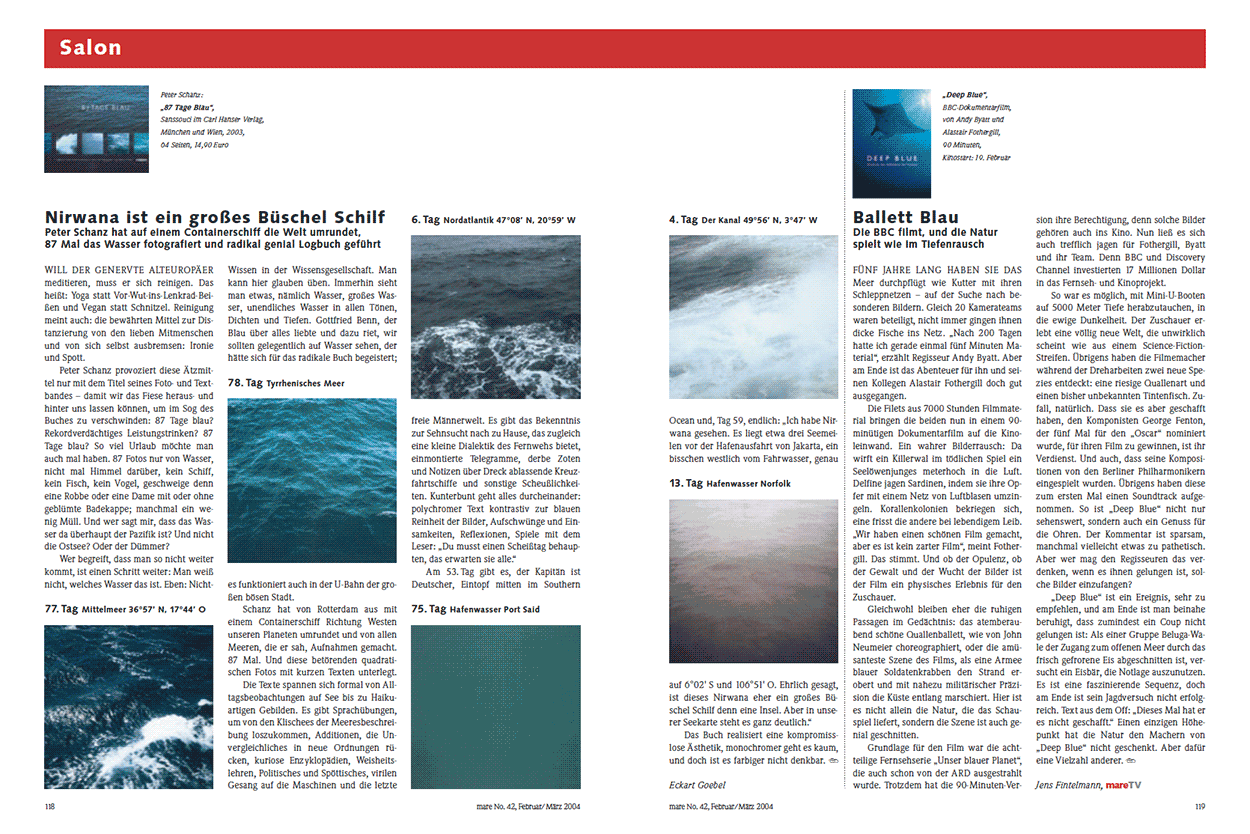 „Deep Blue“ ist ein Ereignis, sehr zu empfehlen, und am Ende ist man beinahe beruhigt, dass zumindest ein Coup nicht gelungen ist: Als einer Gruppe Beluga-Wale der Zugang zum offenen Meer durch das frisch gefrorene Eis abgeschnitten ist, versucht ein Eisbär, die Notlage auszunutzen. Es ist eine faszinierende Sequenz, doch am Ende ist sein Jagdversuch nicht erfolgreich. Text aus dem Off: „Dieses Mal hat er es nicht geschafft.“ Einen einzigen Höhepunkt hat die Natur den Machern von „Deep Blue“ nicht geschenkt. Aber dafür eine Vielzahl anderer. Jens Fintelmann, mareTV