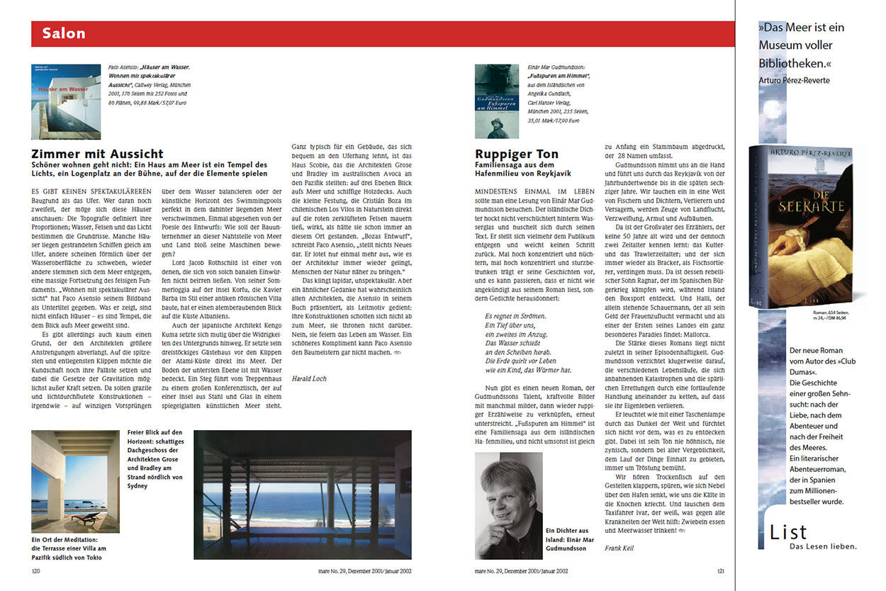 Paco Asensio: „Häuser am Wasser. Wohnen mit spektakulärer Aussicht“, Callwey Verlag, München 2001, 176 Seiten mit 252 Fotos und 86 Plänen, 99,88 Mark/57,07 Euro