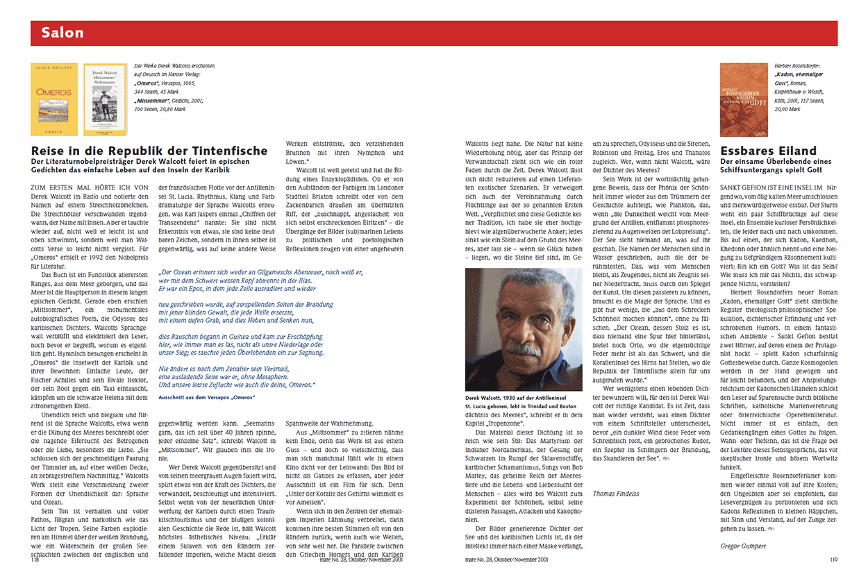 Die Werke Derek Walcotts erscheinen auf Deutsch im Hanser Verlag: „Omeros“, Versepos, 1995, 344 Seiten, 45 Mark „Mittsommer“, Gedicht, 2001, 160 Seiten, 29,80 Mark