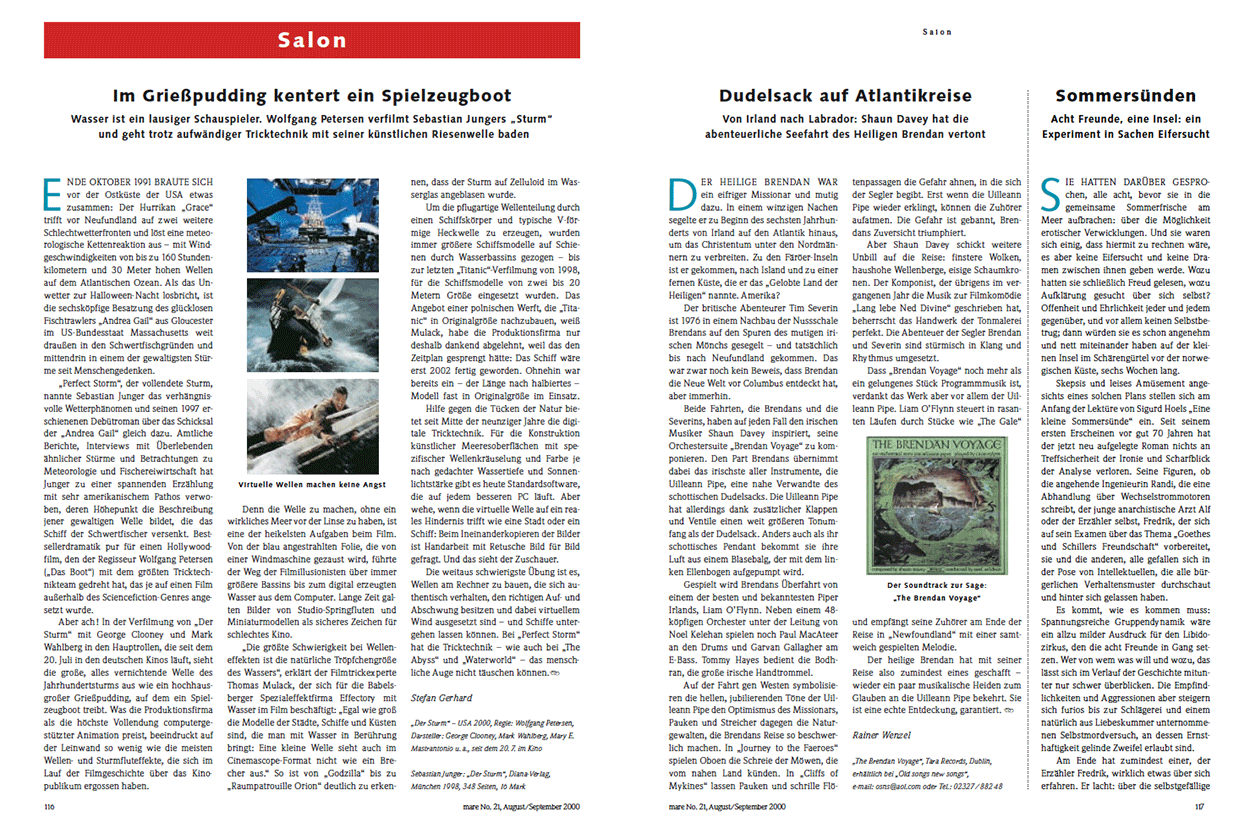 „Perfect Storm“, der vollendete Sturm, nannte Sebastian Junger das verhängnisvolle Wetterphänomen und seinen 1997 erschienenen Debütroman über das Schicksal der „Andrea Gail“ gleich dazu. Amtliche Berichte, Interviews mit Überlebenden ähnlicher Stürme und Betrachtungen zu Meteorologie und Fischereiwirtschaft hat Junger zu einer spannenden Erzählung mit sehr amerikanischem Pathos verwoben, deren Höhepunkt die Beschreibung jener gewaltigen Welle bildet, die das Schiff der Schwertfischer versenkt. Bestsellerdramatik pur für einen Hollywoodfilm, den der Regisseur Wolfgang Petersen („Das Boot“) mit dem größten Tricktechnikteam gedreht hat, das je auf einen Film außerhalb des Sciencefiction-Genres angesetzt wurde.