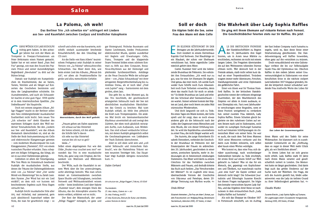 Der Wille, auch die Raumfahrt in seinem Werk über die See unterzubringen, wirkt allerdings bemüht. Was man schon immer an Gemeinsamkeiten zwischen Space Shuttle und Schanghaien, zwischen Fernweh und Weltraumkrankheit wissen wollte – beim kindlichen Lied über Rakete „Nummer neun“, dem einzigen Stück des Albums, das die Atmosphäre unseres Planeten verlässt, erfahren wir es nicht.