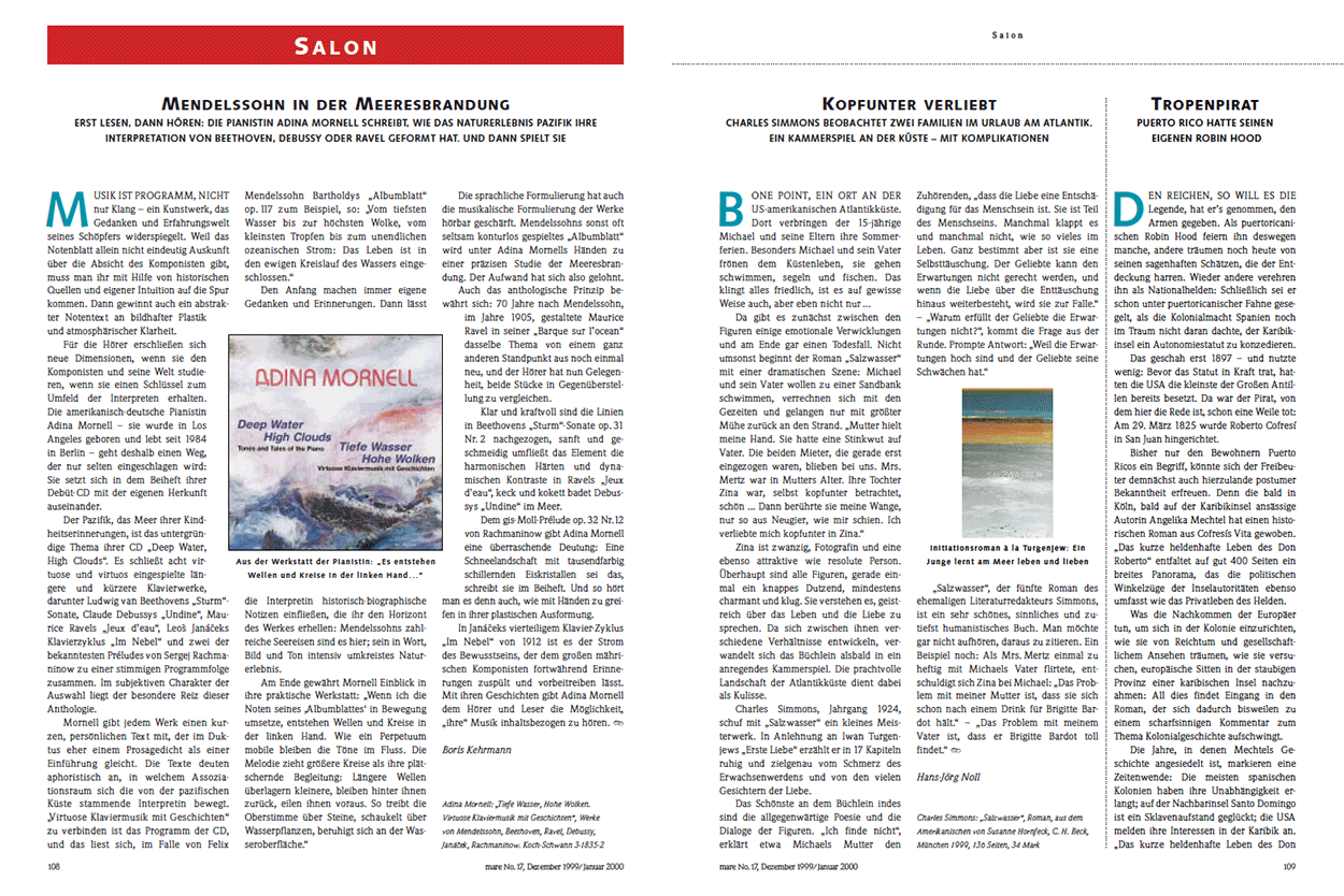 „Salzwasser“, der fünfte Roman des ehemaligen Literaturredakteurs Simmons, ist ein sehr schönes, sinnliches und zutiefst humanistisches Buch. Man möchte gar nicht aufhören, daraus zu zitieren. Ein Beispiel noch: Als Mrs. Mertz einmal zu heftig mit Michaels Vater flirtete, entschuldigt sich Zina bei Michael: „Das Problem mit meiner Mutter ist, dass sie sich schon nach einem Drink für Brigitte Bardot hält.“ – „Das Problem mit meinem Vater ist, dass er Brigitte Bardot toll findet.“ Hans-Jörg Noll