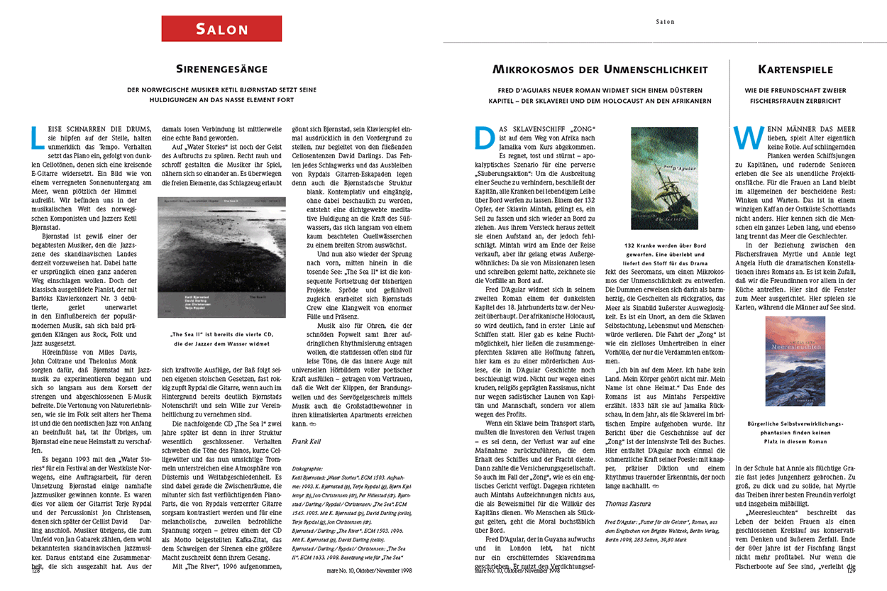 Musik also für Ohren, die der schnöden Popwelt samt ihrer aufdringlichen Rhythmisierung entsagen wollen, die stattdessen offen sind für leise Töne, die das innere Auge mit universellen Hörbildern voller poetischer Kraft ausfüllen – getragen vom Vertrauen, daß die Welt der Klippen, der Brandungswellen und des Seevögelgeschreis mittels Musik auch die Großstadtbewohner in ihren klimatisierten Apartments erreichen kann. Frank Keil