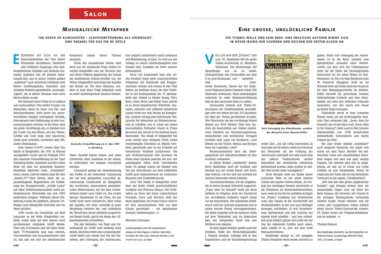 John Adams (*1947) zweite Oper The Death of Klinghoffer, die 1991 in Brüssel uraufgeführt wurde und im Frühjahr 1997 ihre deutsche Erstaufführung an der Oper Nürnberg erfuhr, behandelt auf den ersten Blick ein dem der genannten Katastrophenfilme ähnliches Sujet. „Schlimmer“ noch, Adams Libretto könnte man für eine „Reality-TV“-Oper halten, denn die zugrundeliegende Begebenheit, die Entführung des Passagierschiffs „Achille Lauro“ auf einer Mittelmeerkreuzfahrt durch palästinensische Terroristen, hat sich 1985 tatsächlich ereignet. Während dieser Entführung wurde der gelähmte, jüdische US-Bürger Leon Klinghoffer ermordet und ins Meer gestürzt.