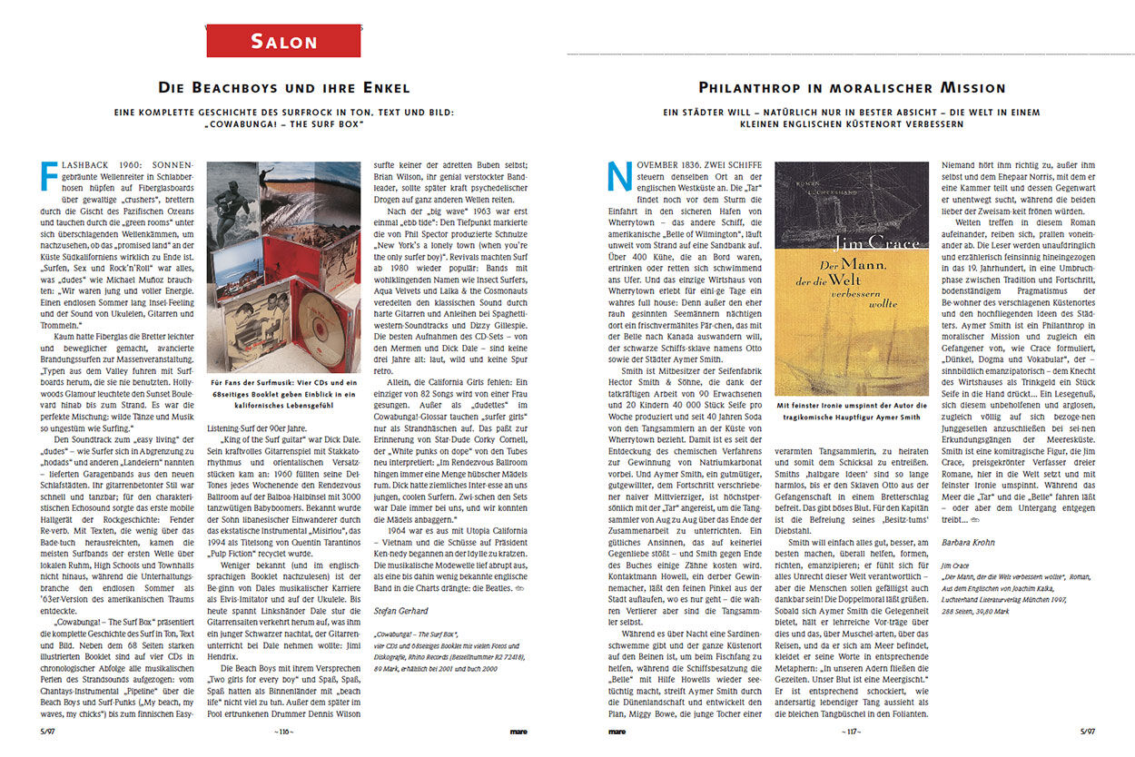 „Cowabunga! – The Surf Box“ präsentiert die komplette Geschichte des Surf in Ton, Text und Bild. Neben dem 68 Seiten starken illustrierten Booklet sind auf vier CDs in chronologischer Abfolge alle musikalischen Perlen des Strandsounds aufgezogen: vom Chantays-Instrumental „Pipeline“ über die Beach Boys und Surf-Punks („My beach, my waves, my chicks“) bis zum finnischen Easy-Listening-Surf der 90er Jahre.