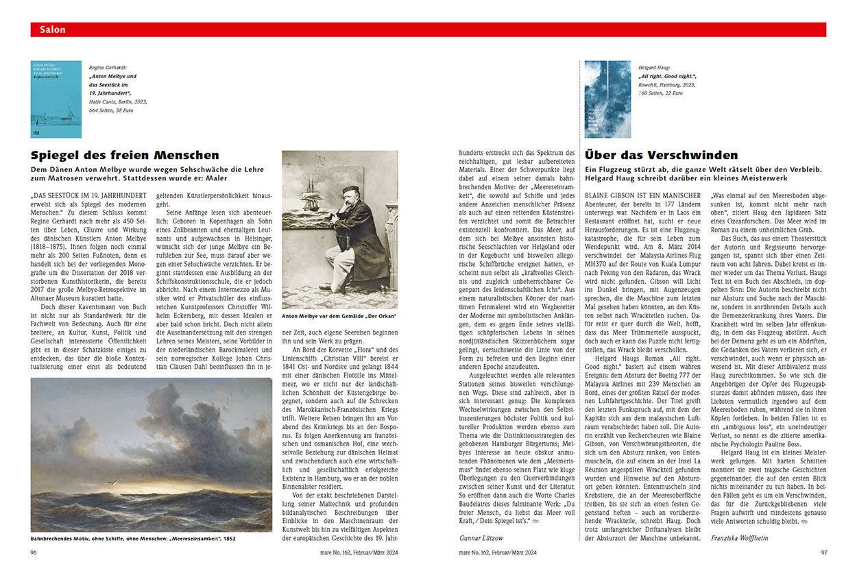 Ausgeleuchtet werden alle relevanten Stationen seines bisweilen verschlungenen Wegs. Diese sind zahlreich, aber in sich interessant genug: Die komplexen Wechselwirkungen zwischen den Selbstinszenierungen höchster Politik und kultureller Produktion werden ebenso zum Thema wie die Distinktionsstrategien des gehobenen Hamburger Bürgertums; Melbyes Interesse an heute obskur anmutenden Phänomenen wie dem „Mesmerismus“ findet ebenso seinen Platz wie kluge Überlegungen zu den Querverbindungen zwischen seiner Kunst und der Literatur. So eröffnen dann auch die Worte Charles Baudelaires dieses fulminante Werk: „Du freier Mensch, du liebst das Meer voll Kraft, / Dein Spiegel ist’s.“ Gunnar Lützow