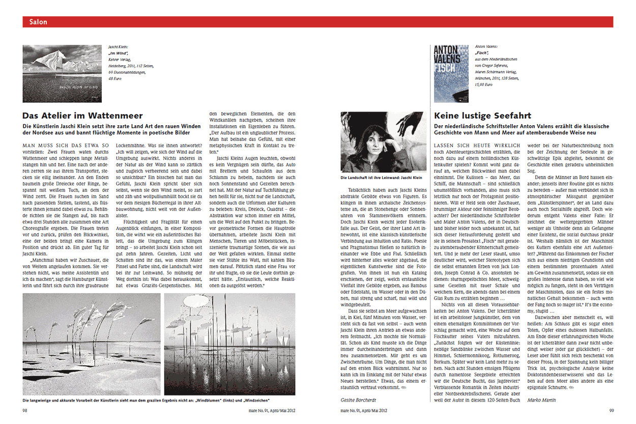 Tatsächlich haben auch Jaschi Kleins abstrakte Gebilde etwas von Figuren. Es klingen in ihnen archaische Zeichensysteme an, die an Stonehenge oder Sonnenuhren von Stammesvölkern erinnern. Doch Jaschi Klein weicht jeder Esoterikfalle aus. Der Geist, der ihrer Land Art innewohnt, ist eine klassisch-künstlerische Verbindung aus Intuition und Ratio. Poesie und Pragmatismus fließen so natürlich ineinander wie Ebbe und Flut. Schließlich wird hinterher alles wieder abgebaut, die eigentlichen Kunstwerke sind die Fotografien. Von ihnen ist nun ein Katalog erschienen, der zeigt, welch erstaunliche Vielfalt ihre Gebilde ergeben, aus Bambus oder Edelstahl, im Wasser oder in den Dünen, mal streng und scharf, mal wild und windgebeutelt.