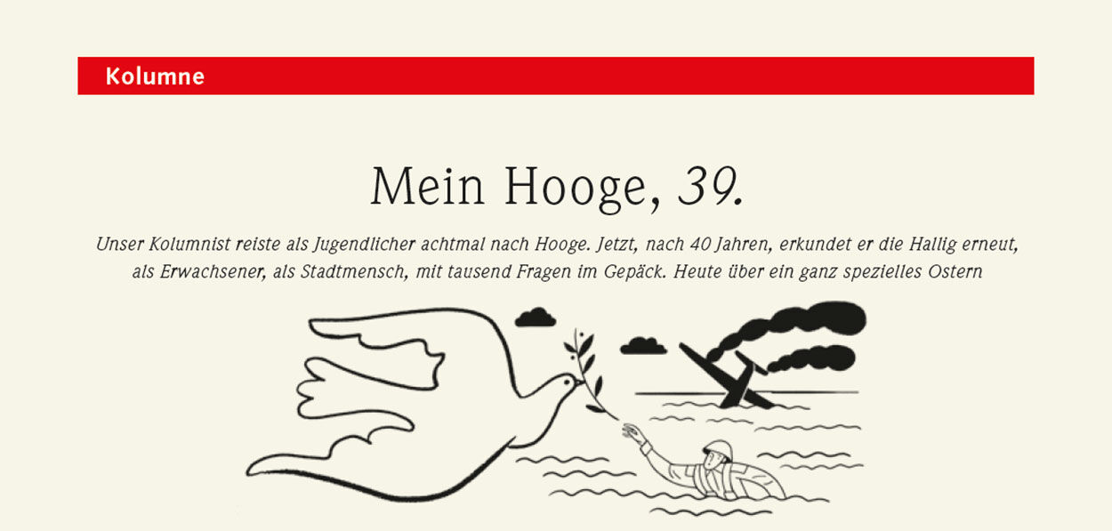 Unser Kolumnist reiste als Jugendlicher achtmal nach Hooge. Jetzt, nach 40 Jahren, erkundet er die Hallig erneut, als Erwachsener, als Stadtmensch, mit tausend Fragen im Gepäck. Heute über ein ganz spezielles Ostern