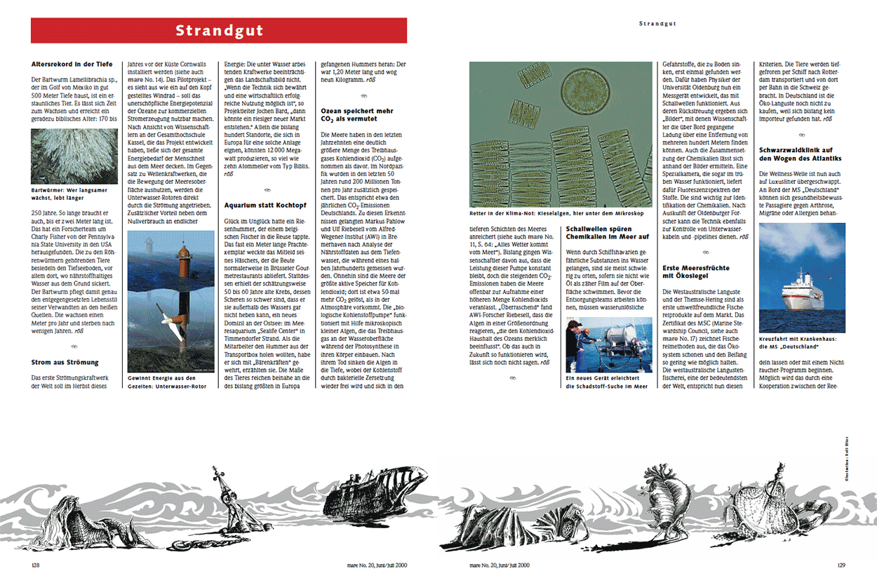 Das erste Strömungskraftwerk der Welt soll im Herbst dieses Jahres vor der Küste Cornwalls installiert werden (siehe auch mare No. 14). Das Pilotprojekt – es sieht aus wie ein auf den Kopf gestelltes Windrad – soll das unerschöpfliche Energiepotenzial der Ozeane zur kommerziellen Stromerzeugung nutzbar machen. Nach Ansicht von Wissenschaftlern an der Gesamthochschule Kassel, die das Projekt entwickelt haben, ließe sich der gesamte Energiebedarf der Menschheit aus dem Meer decken. Im Gegensatz zu Wellenkraftwerken, die die Bewegung der Meeresoberfläche ausnutzen, werden die Unterwasser-Rotoren direkt durch die Strömung angetrieben. Zusätzlicher Vorteil neben dem Nullverbrauch an endlicher Energie: Die unter Wasser arbeitenden Kraftwerke beeinträchtigen das Landschaftsbild nicht. „Wenn die Technik sich bewährt und eine wirtschaftlich erfolgreiche Nutzung möglich ist“, so Projektleiter Jochen Bard, „dann könnte ein riesiger neuer Markt entstehen.“ Allein die bislang hundert Standorte, die sich in Europa für eine solche Anlage eignen, könnten 12000 Megawatt produzieren, so viel wie zehn Atommeiler vom Typ Biblis. röß