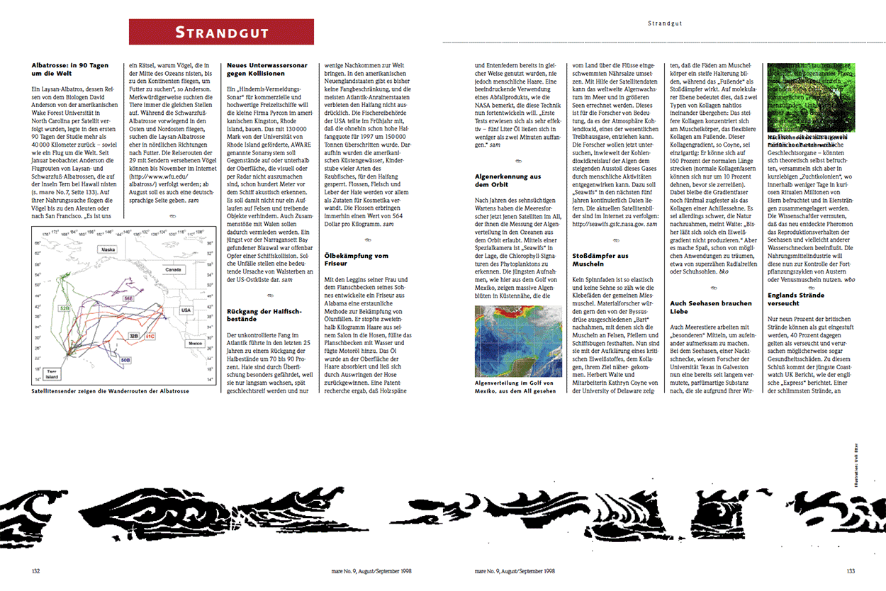 Ein Laysan-Albatros, dessen Reisen von dem Biologen David Anderson von der amerikanischen Wake Forest Universität in North Carolina per Satellit verfolgt wurden, legte in den ersten 90 Tagen der Studie mehr als 40000 Kilometer zurück – soviel wie ein Flug um die Welt. Seit Januar beobachtet Anderson die Flugrouten von Laysan- und Schwarzfuß-Albatrossen, die auf der Inseln Tern bei Hawaii nisten (s. mare No. 7, Seite 133). Auf ihrer Nahrungssuche flogen die Vögel bis zu den Aleuten oder nach San Francisco. „Es ist uns ein Rätsel, warum Vögel, die in der Mitte des Ozeans nisten, bis zu den Kontinenten fliegen, um Futter zu suchen“, so Anderson. Merkwürdigerweise suchten die Tiere immer die gleichen Stellen auf. Während die Schwarzfuß-Albatrosse vorwiegend in den Osten und Nordosten fliegen, suchen die Laysan-Albatrosse eher in nördlichen Richtungen nach Futter. Die Reiserouten der 29 mit Sendern versehenen Vögel können bis November im Internet (http://www.wfu.edu/albatross/) verfolgt werden; ab August soll es auch eine deutschsprachige Seite geben. sam