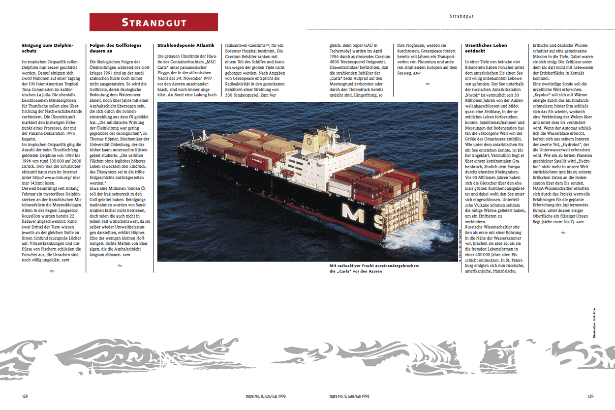 Die genauen Umstände der Havarie des Containerfrachters „MSC Carla“ unter panamesischer Flagge, der in der stürmischen Nacht des 24. November 1997 vor den Azoren auseinanderbrach, sind noch immer ungeklärt. An Bord: eine Ladung hoch radioaktiven Caesiums137, für ein Bostoner Hospital bestimmt. Die Caesium-Behälter sanken mit einem Teil des Schiffes und konnten wegen der großen Tiefe nicht geborgen werden. Nach Angaben von Greenpeace entspricht die Radioaktivität in den gesunkenen Behältern einer Strahlung von 330 Terabecquerel. Zum Vergleich: Beim Super-GAU in Tschernobyl wurden im April 1986 durch austretendes Caesium 4800 Terabecquerel freigesetzt. Umweltschützer befürchten, daß die strahlenden Behälter der „Carla“ beim Aufprall auf den Meeresgrund zerborsten oder durch den Tiefendruck bereits undicht sind. Längerfristig, so ihre Prognosen, werden sie durchrosten. Greenpeace fordert bereits seit Jahren ein Transportverbot von Plutonium und anderen strahlenden Isotopen auf dem Seeweg. asw