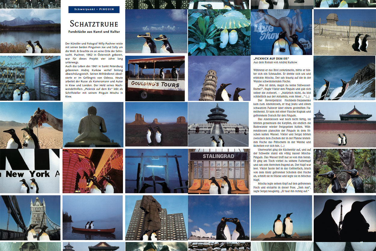 Der Künstler und Fotograf Willy Puchner reiste mit seinen beiden Pinguinen Joe und Sally um die Welt. Er brachte sie an seine Orte der Sehnsucht. Puchner, 1952 in Österreich geboren, war für dieses Projekt vier Jahre lang unterwegs.