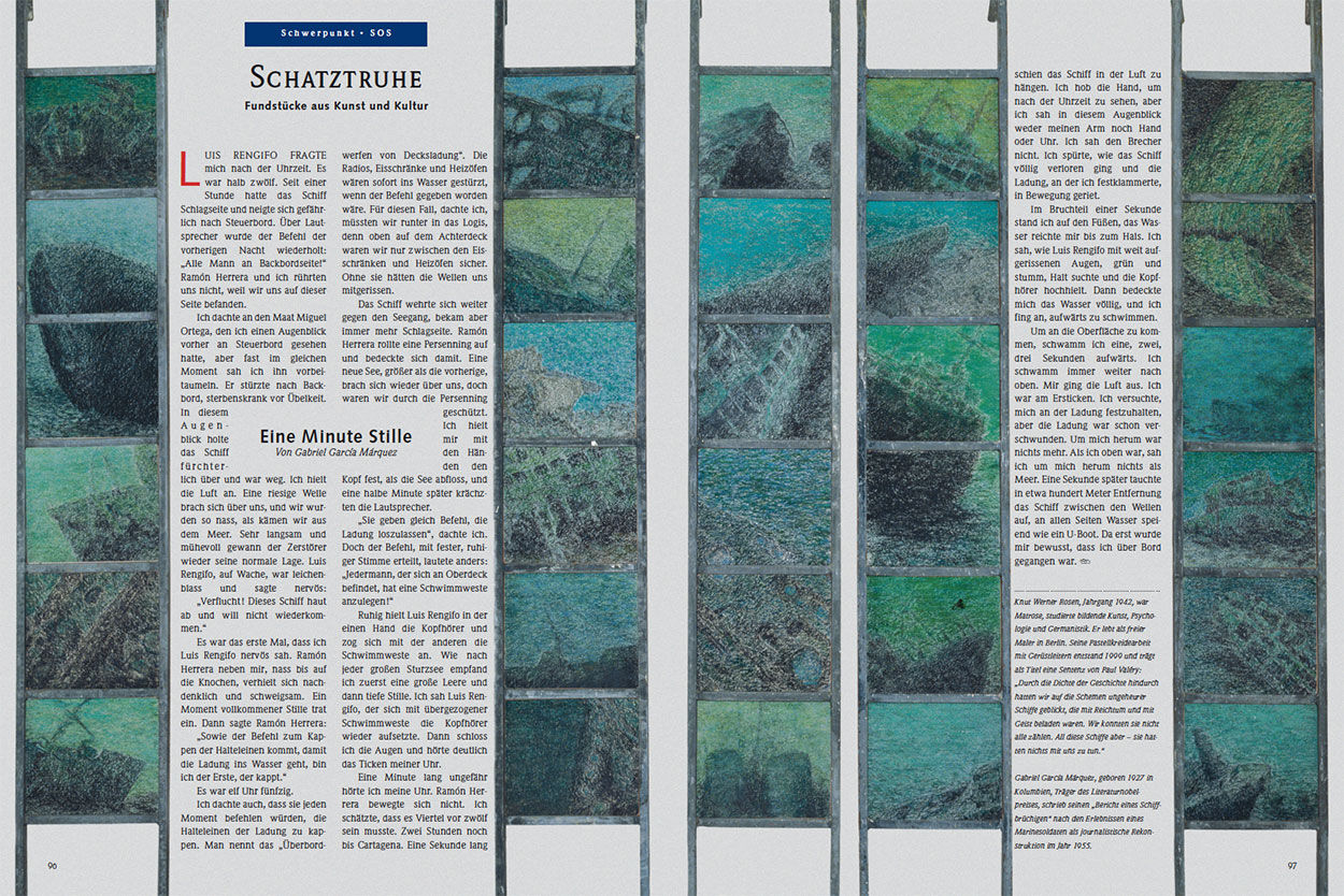 | Vita | Knut Werner Rosen, Jahrgang 1942, war Matrose, studierte bildende Kunst, Psychologie und Germanistik. Er lebt als freier Maler in Berlin. Seine Pastellkreidearbeit mit Gerüstleitern entstand 1999 und trägt als Titel eine Sentenz von Paul Valéry: „Durch die Dichte der Geschichte hindurch hatten wir auf die Schemen ungeheurer Schiffe geblickt, die mit Reichtum und mit Geist beladen waren. Wir konnten sie nicht alle zählen. All diese Schiffe aber – sie hatten nichts mit uns zu tun.“