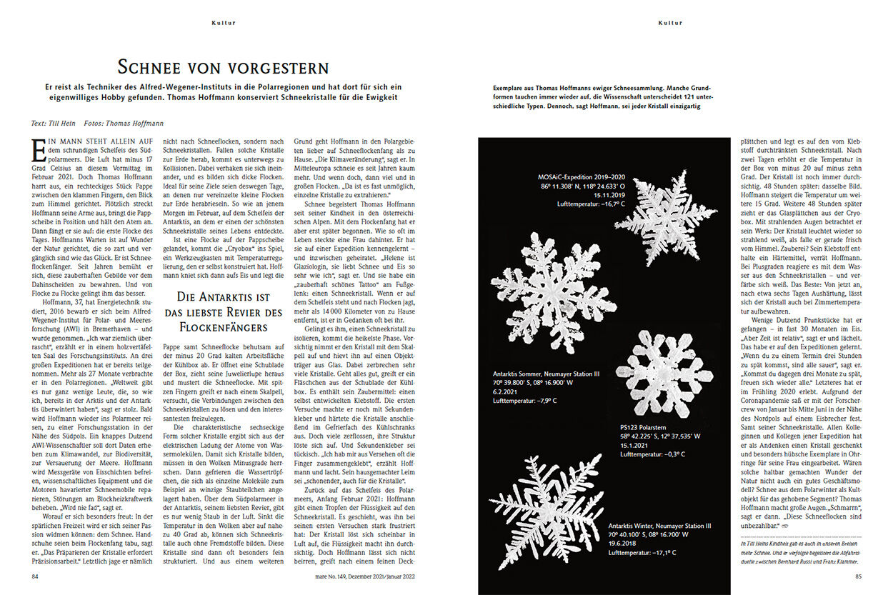 Ein Mann steht allein auf dem schrundigen Schelfeis des Südpolarmeers. Die Luft hat minus 17 Grad Celsius an diesem Vormittag im Februar 2021. Doch Thomas Hoffmann harrt aus, ein rechteckiges Stück Pappe zwischen den klammen Fingern, den Blick zum Himmel gerichtet. Plötzlich streckt Hoffmann seine Arme aus, bringt die Pappscheibe in Position und hält den Atem an. Dann fängt er sie auf: die erste Flocke des Tages. Hoffmanns Warten ist auf Wunder der Natur gerichtet, die so zart und vergänglich sind wie das Glück. Er ist Schneeflockenfänger. Seit Jahren bemüht er sich, diese zauberhaften Gebilde vor dem Dahinscheiden zu bewahren.