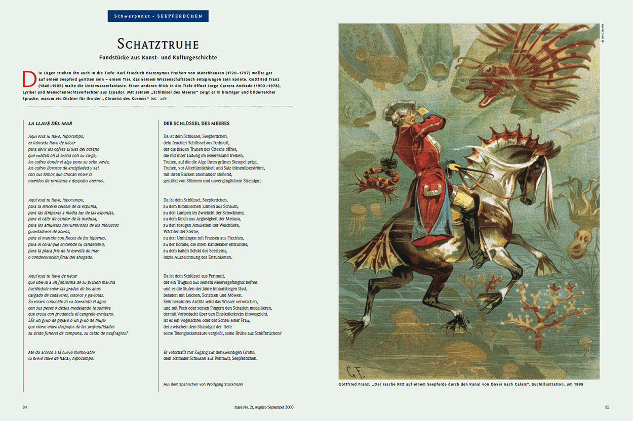 Die Lügen trieben ihn auch in die Tiefe: Karl Friedrich Hieronymus Freiherr von Münchhausen (1720–1797) wollte gar auf einem Seepferd geritten sein – einem Tier, das keinem Wissenschaftsbuch entsprungen sein konnte. Gottfried Franz (1846–1905) malte die Unterwasserfantasie. Einen anderen Blick in die Tiefe öffnet Jorge Carrera Andrade (1903–1978), Lyriker und Menschenrechtsverfechter aus Ecuador. Mit seinem „Schlüssel des Meeres“ zeigt er in blumiger und bilderreicher Sprache, warum ein Dichter für ihn der „Chronist des Kosmos“ ist. zdb