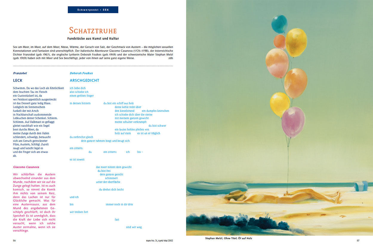 Sex am Meer, im Meer, auf dem Meer, Nässe, Wärme, der Geruch von Salz, der Geschmack von Austern – die möglichen sexuellen Konnotationen und Fantasien sind unerschöpflich. Der italienische Abenteurer Giacomo Casanova (1725–1798), der österreichische Dichter Franzobel (geb. 1967), die englische Lyrikerin Deborah Foulkes (geb. 1959) und der schweizerische Maler Stephan Melzl (geb. 1959) haben sich mit Meer und Sex beschäftigt, jeder von ihnen auf seine ganz eigene Weise. zdb
