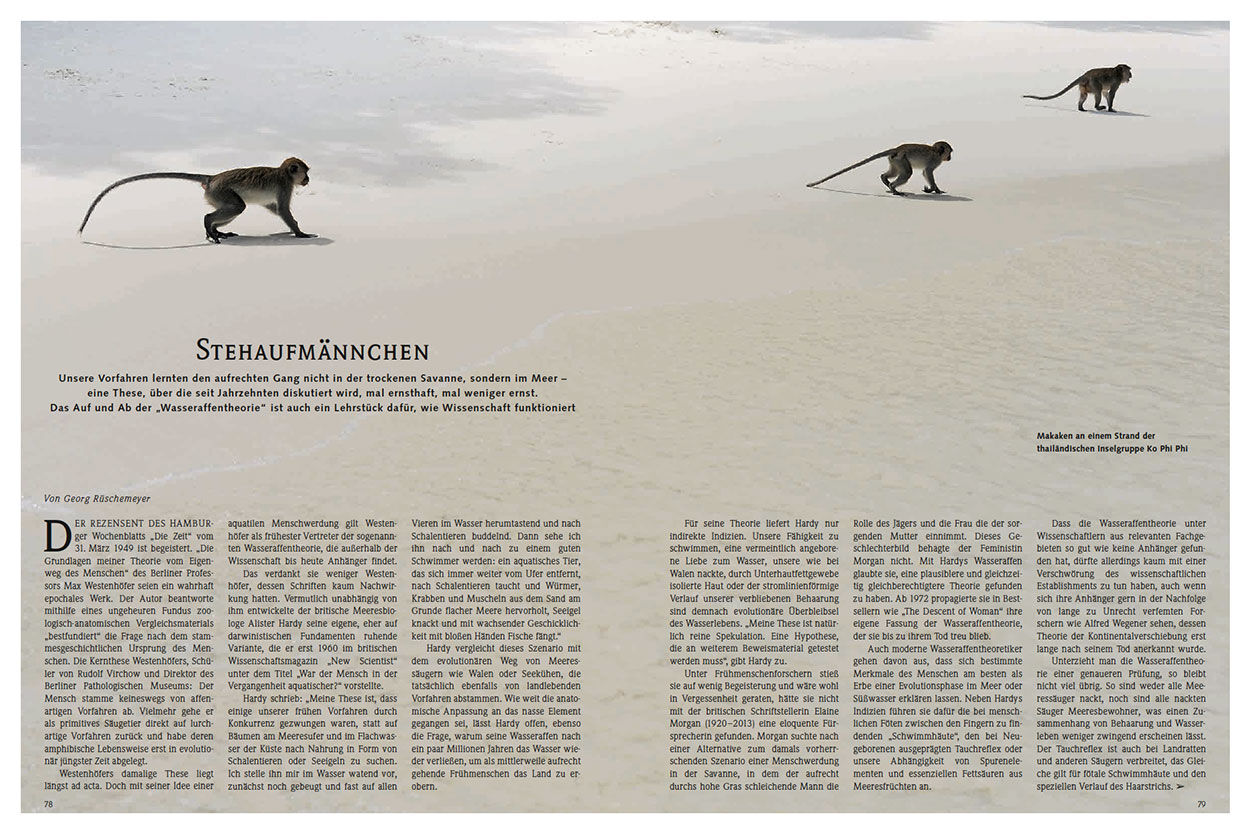 Eine genetisch veranlagte Affinität des Menschen zum Wasser scheint zumindest auf Georg Rüschemeyer, Jahrgang 1970, Wissenschaftsjournalist im englischen York, zuzutreffen. Sobald es die Temperaturen zuließen, verbrachte er als Jugendlicher einen großen Teil seiner Freizeit mit Schnorchel und Taucherbrille im örtlichen Baggersee.