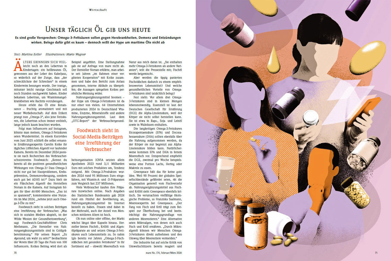 Foodwatch sieht in solchen Beiträgen eine Irreführung der Verbraucher. „Was sich in sozialen Medien abspielt, ist der Wilde Westen der Gesundheitswerbung“, sagt Foodwatch-Geschäftsführer Chris Methmann. „Die Hersteller von Nahrungsergänzungsmitteln sind in Goldgräberstimmung.“ Für seinen Report „Zu #gesund, um wahr zu sein?“ beobachtete der Verein über 20 Tage die Posts von 100 Influencern. Kotkes Beitrag wird dort als Beispiel angeführt. Eine Stellungnahme gab sie auf Anfrage von mare nicht ab. Der Hersteller Norsan erklärte, man arbeite seit Jahren „im Rahmen einer vergüteten Kooperation“ mit Kotke zusammen und habe den Bericht zum Anlass genommen, interne Abläufe zu überprüfen; die Aussagen spiegelten Kotkes persönliche Meinung wider.