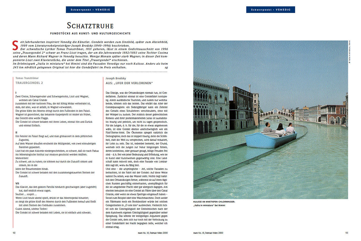Seit Jahrhunderten inspiriert Venedig die Künstler. Gondeln werden zum Sinnbild, später zum Abziehbild, 1989 vom Literaturnobelpreisträger Joseph Brodsky (1940–1996) beschrieben. Der schwedische Lyriker Tomas Tranströmer, 1931 geboren, lässt in einem Gedichtausschnitt von 1996 seine „Trauergondel 2“ schwer an Franz Liszt tragen, der um die Jahreswende 1882/1883 seine Tochter Cosima und deren Mann Richard Wagner in Venedig besuchte. Wenige Monate später starb Wagner; in dieser Zeit komponierte Liszt zwei Klavierstücke, die unter dem Titel „Trauergondel“ erschienen. Im Erlebnispark „Italia in miniatura“ bei Rimini sind die Fassaden Venedigs nur noch Kulisse. Anders als beim 245 km nördlich gelegenen Original ist hier die Gondelfahrt im Preis enthalten. sg