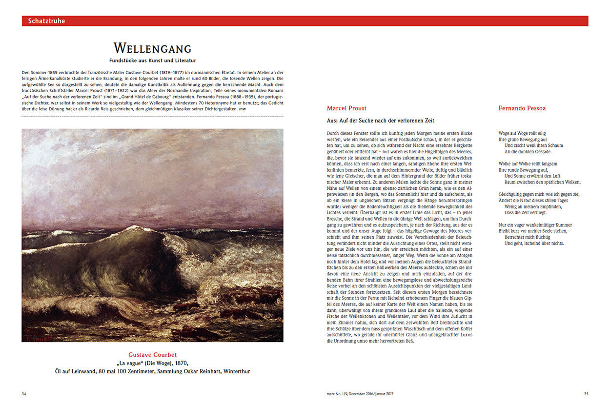Den Sommer 1869 verbrachte der französische Maler Gustave Courbet (1819 –1877) im normannischen Étretat. In seinem Atelier an der felsigen Ärmelkanalküste studierte er die Brandung, in den folgenden Jahren malte er rund 60 Bilder, die tosende Wellen zeigen. Die aufgewühlte See so dargestellt zu sehen, deutete die damalige Kunstkritik als Auflehnung gegen die herrschende Macht. Auch dem französischen Schriftsteller Marcel Proust (1871–1922) war das Meer der Normandie Inspiration; Teile seines monumentalen Romans „Auf der Suche nach der verlorenen Zeit“ sind im „Grand Hôtel de Cabourg“ entstanden. Fernando Pessoa (1888 –1935), der portugiesische Dichter, war selbst in seinem Werk so vielgestaltig wie der Wellengang. Mindestens 70 Heteronyme hat er benutzt; das Gedicht über die leise Dünung hat er als Ricardo Reis geschrieben, dem gleichmütigen Klassiker seiner Dichtergestalten. mw