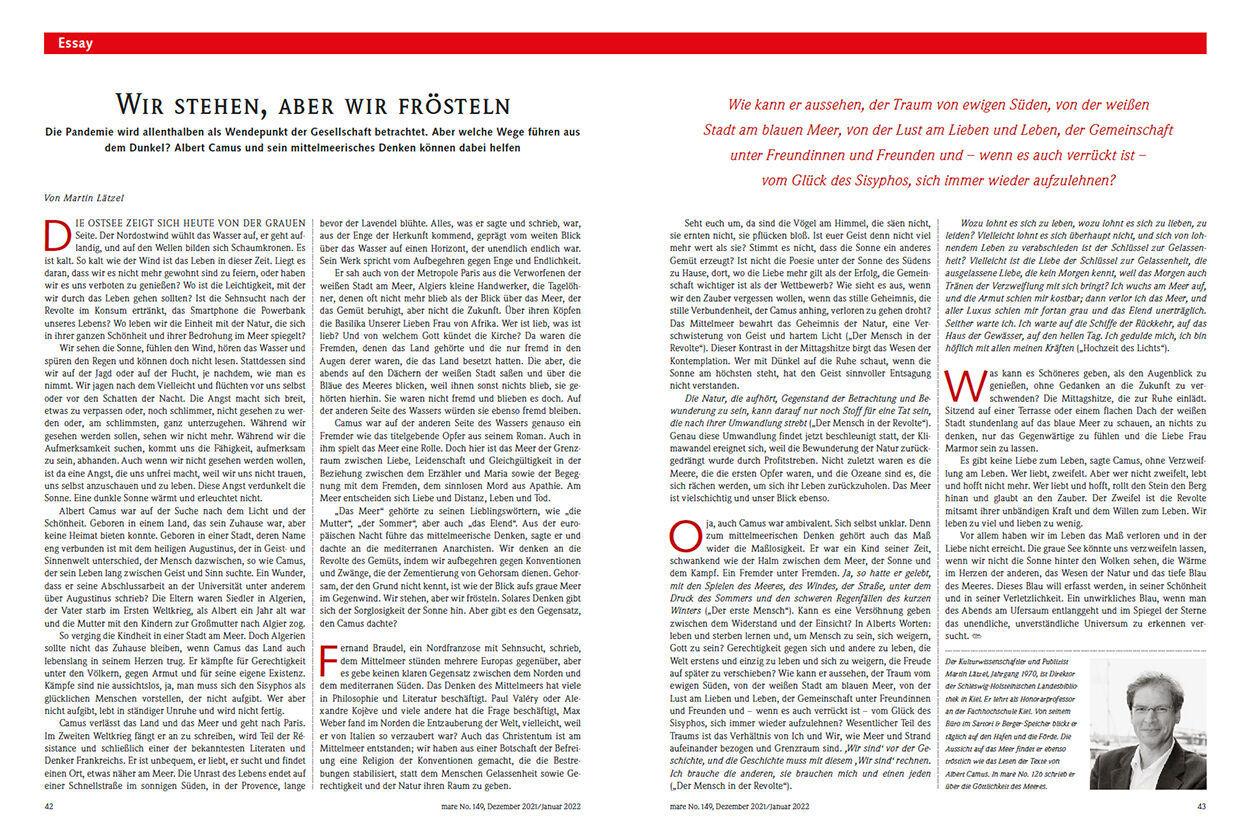 | Vita | Der Kulturwissenschaftler und Publizist Martin Lätzel, Jahrgang 1970, ist Direktor der Schleswig-Holsteinischen Landesbibliothek in Kiel. Er lehrt als Honorarprofessor an der Fachhochschule Kiel. Von seinem Büro im Sartori & Berger-Speicher blickt er täglich auf den Hafen und die Förde. Die Aussicht auf das Meer findet er ebenso tröstlich wie das Lesen der Texte von Albert Camus. In mare No. 126 schrieb er über die Göttlichkeit des Meeres. |
